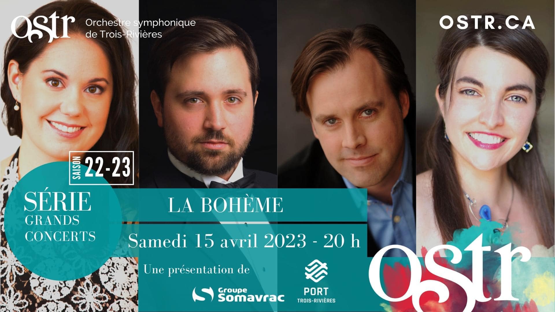 L’Orchestre symphonique de Trois-Rivières propose une version animée et vivante de ce chef-d’œuvre qui mettra en vedette le ténor américain Jonathan Boyd (Rodolfo), la jeune soprano québécoise Myriam Leblanc (Mimi), gagnante du prix Coup de cœur du public au Concours de l’OSTR en 2014, le baryton québécois Hugo Laporte (Marcello), qui vient tout juste de monter sur les planches de la mythique Scala de Milan ainsi que la soprano trifluvienne Geneviève Lenoir (Musetta) qui s’est démarquée dans de nombreux rôles lyriques. La distribution sera complétée que par les chanteurs lyriques Dominique Côté (Schaunard), Stephen Hegedus (Colline), Mischael Eusebio (Parpignol), Matthew Li (sergent des douanes) et Claude Grenier (Benoit et Alcindoro).